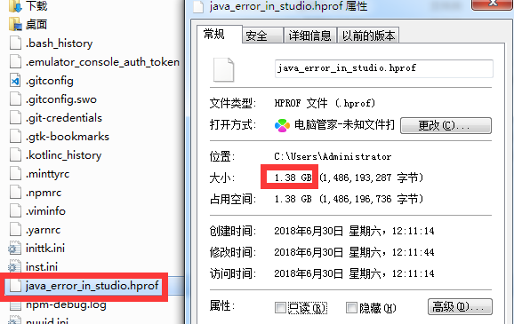 .android 占用了10G .AndroidStudio3.1 占用了973M .gradle 占用了3G 还有一个隐藏文件 AppData 占用了 11.6G 还有一个文件`java_error_in_studio.hprof` 占用了1.38G (如下图所示)