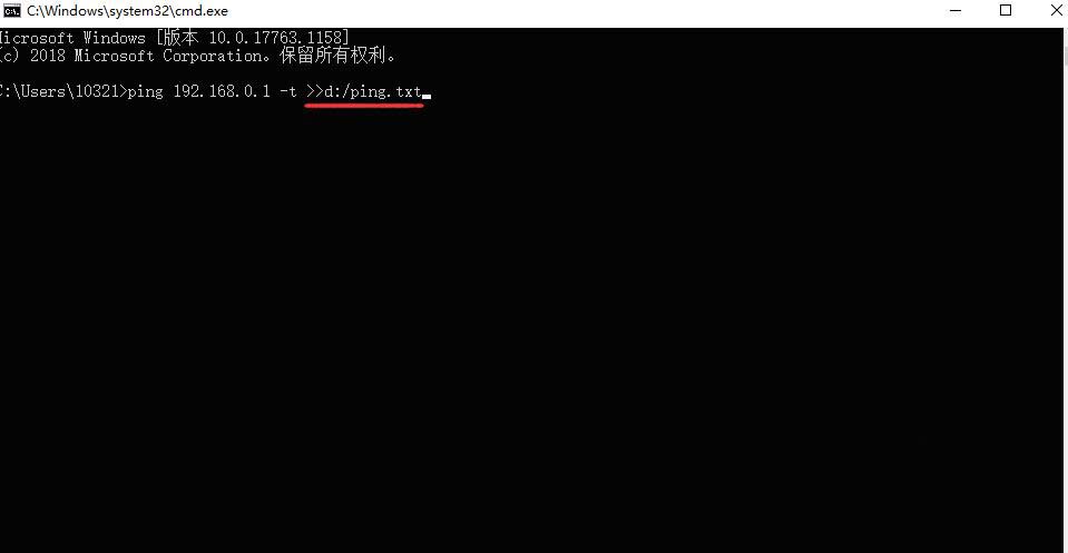 输入命令:ping 192.168.0.1 -t >>d:/ping.txt,回车