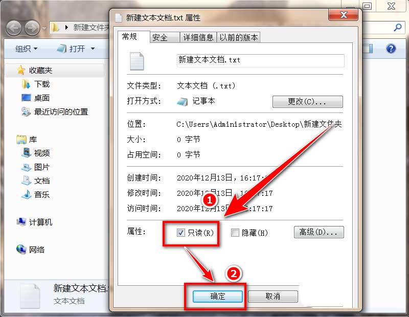 3、在属性窗口中,勾选“只读”属性,再点击“确定”按钮,即可将此txt文档设置为禁止修改。