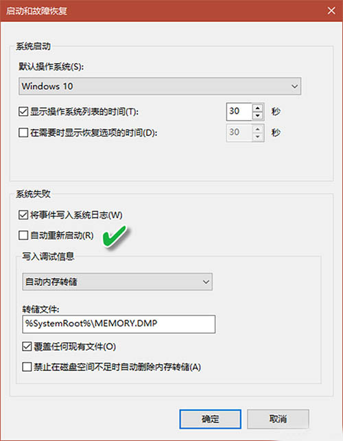 接下来,在“系统属性”窗口的“高级”选项卡下,点击“启动与故障恢复”分组下的“设置”按钮(图2)。在随后出现的“启动和故障恢复”窗口中,将“系统失败”分组中的“自动重新启动”复选框中的√去掉,然后点击“确定”按钮即可(图3)。