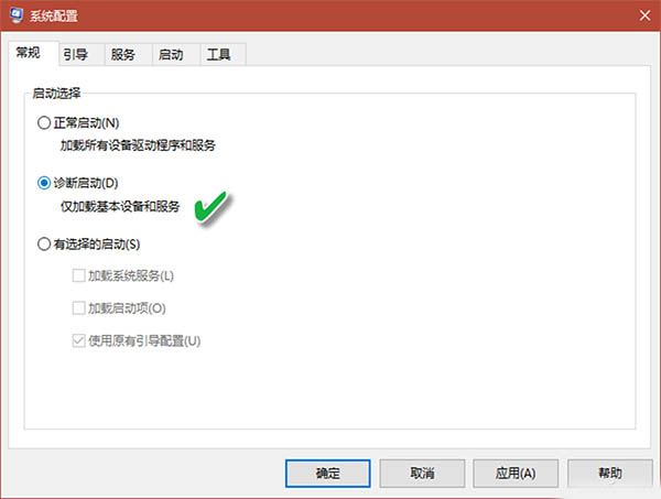 自启动程序本身不合适也会引起系统重启。这时,可先以安全模式启动Windows,然后按下Win+R组合键,运行MSCONFIG命令。在启动的系统配置窗口中,选择“常规”选项卡中的“诊断启动”,以便使启动时仅加载基本的设备和服务(图4)。
