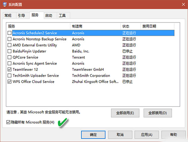 重启系统,然后再次进入系统配置窗口,点击“服务”选项卡,选中“隐藏所有Microsoft服务”复选框,从服务列表中选择需要随系统自动启动的项目进行测试(图5)。为确定问题具体是由哪个程序引起,可一次只选一个程序做实验,直到确定出问题的程序为止。
