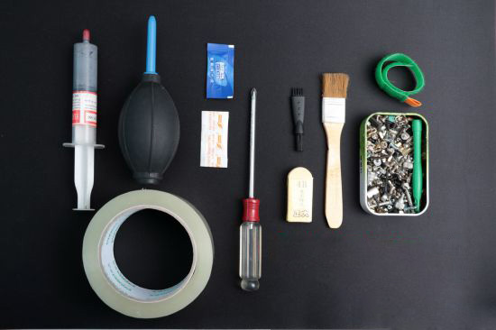 工欲善其事,必先利其器,请提前备好工具。其实对于拆机来说,一把十字螺丝刀即可。但对于清洁和组装工具,还需要准备刷子、气吹、橡皮、胶带和硅脂。有条件的还可以准备上一块超大鼠标垫、一些备用螺丝和扎带。