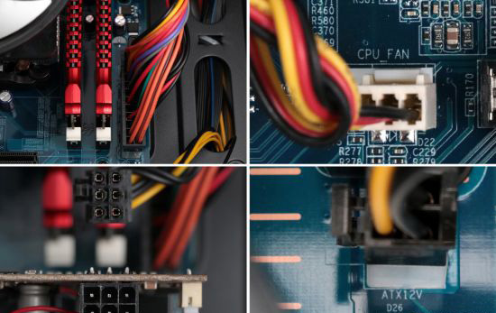 上面这些都是重要的接口,它们分别是主板24Pin供电,CPU风扇(CPU风扇一定要插在“CPUFAN”这个位置,不然开机主板有可能会报错),显卡6pin供电(有的是8Pin),CPU 4Pin或者8Pin供电。