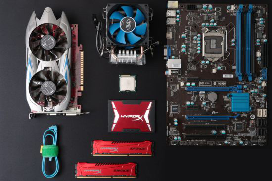 这些就是从机箱内拆下来的所有(必备)配件。依次为显卡,散热器,主板,CPU,SSD,SATA数据线,内存。