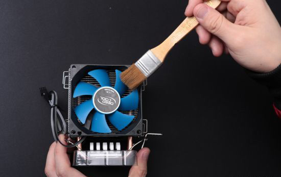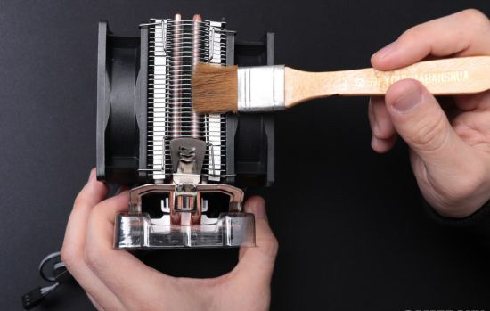 散热器是主机里灰尘集中的重灾区,高手可以尝试拆掉风扇后水洗金属部分的散热器,清洗完毕后依旧记得晾干,或者使用电吹风机吹干。对于新手,建议使用传统的刷子和气吹除尘法,清理风扇叶片内外和散热器鳍片。这部分的清理工作建议移至室外,或者在室内带上口罩进行清理。