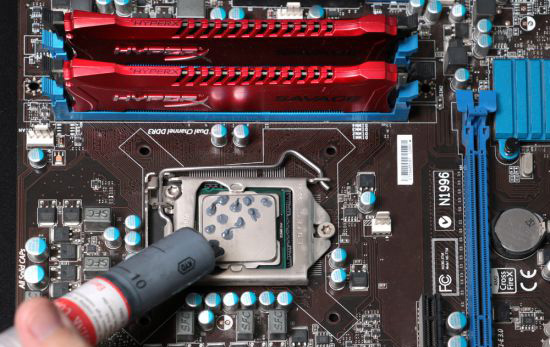 PS:一般CPU都是放正方向即可,注意如果CPU插座杆很难压下去就需要看看是不是装反了,以防把插针压弯压断。安装CPU后,需要涂抹硅脂后再安装散热器。图中这样涂抹硅脂是懒人的惯用方法,没手艺的就这样了,有手艺的可以按照网上的教程只涂抹薄薄一层。