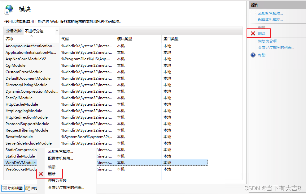 右击WebDAVModule,在右击菜单里点击删除,或者在右侧的操作里点击删除,如下图所示: