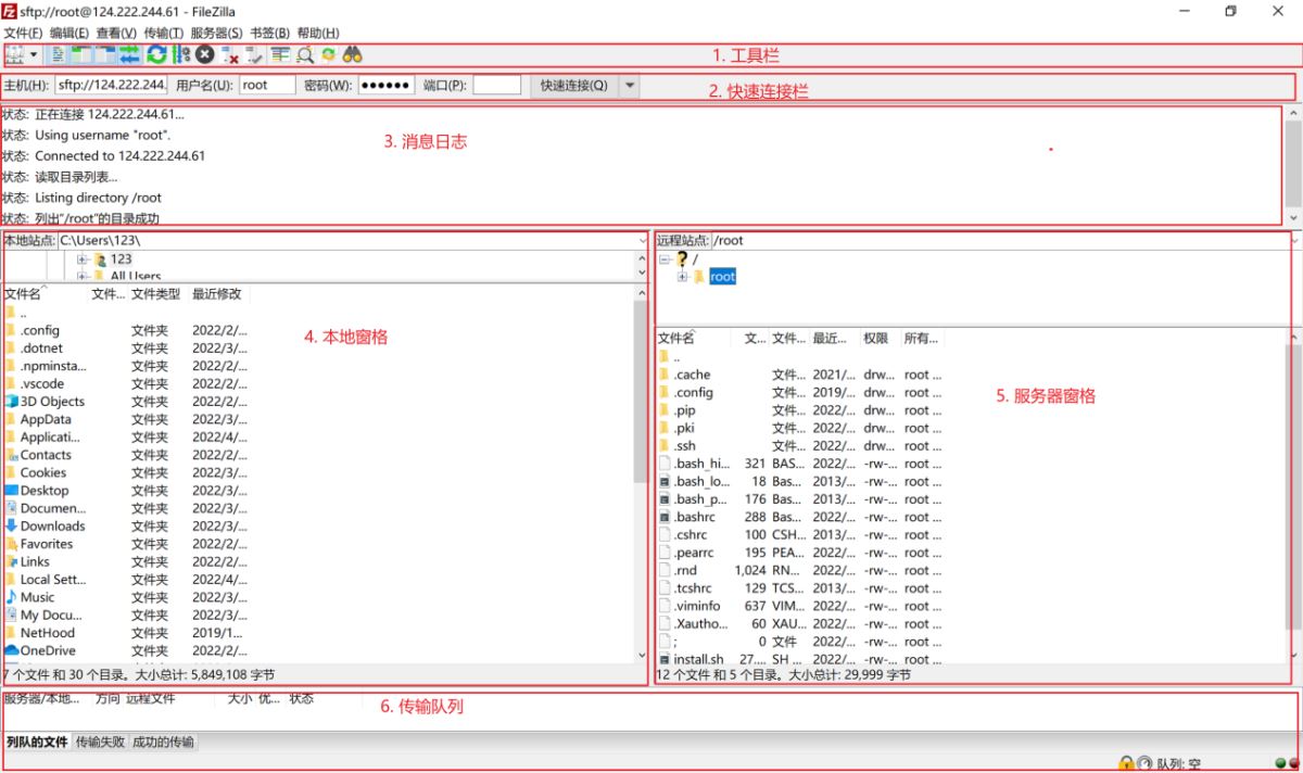 (4) 本地窗格:显示本地文件和目录,即您正在使用 FileZilla 的 PC 上的内容。