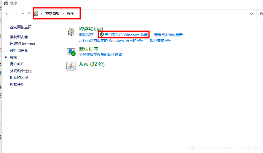 打开控制面板,进入程序,点击启用或关闭Windows功能;