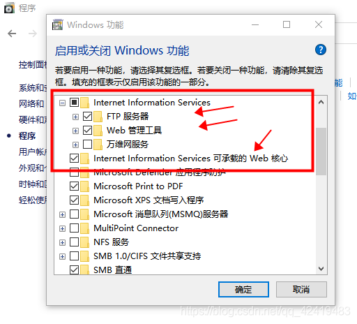 在Windows功能页面上,将FTP服务器、Web管理工具和Internet Information Services可承载的Web核心前打勾,点击确定;