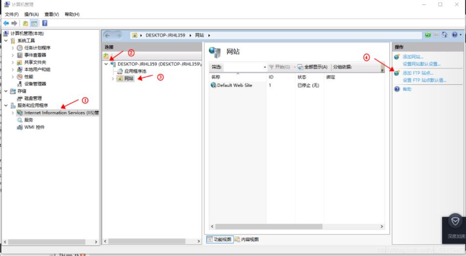 打开计算机管理进入,在左侧找到服务和应用程序,点击展开,点击Internet Information Services(IIS)管理器,在连接一栏可以看到计算机名称(本机为DESKTOP-JRHL359),点击该计算机名左侧的展开按钮,单击网站,右面出现网站的页面,在最右侧的操作页面,单击添加FTP站点;