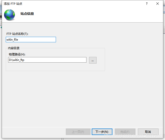 输入FTP站点名称与内容目录路径,该内容目录路径即为搭建成功后,访问网址时看到的目录,点击下一步;