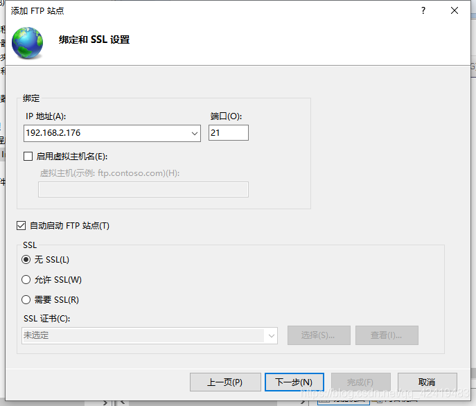 回到绑定和SSL设置页面,选择与刚才查询相同的IP地址,端口默认21不变,可以勾选自动启动FTP站点,SSL可以选择无,操作完成后点击下一步;