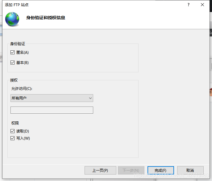 进入身份验证和授权信息页面,身份验证一栏可以勾选匿名和基本,授权一栏允许访问选择所有用户,权限一栏可以勾选读取和写入,完成配置后,点击完成;