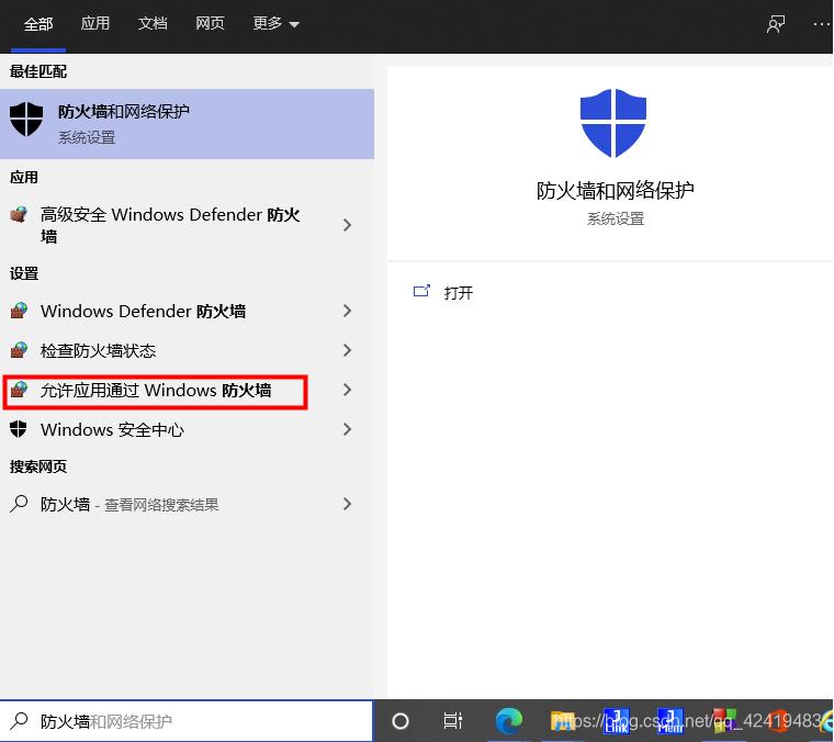 此时不要忘了对防火墙的配置,主页快捷搜索防火墙,点击允许应用通过Windows防火墙;