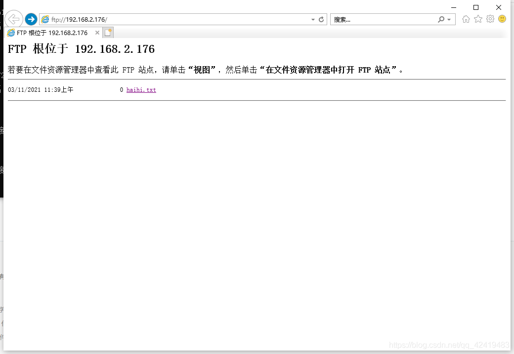 在IE浏览器中输入“ftp:/ /+(IP地址)”(这里为ftp://192.168.2.176/),此时可以看到之前设置的内容目录路径下的文件啦