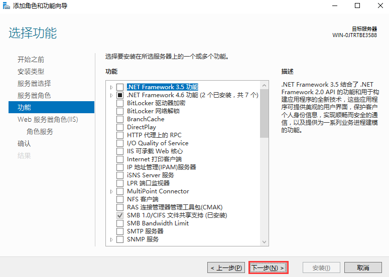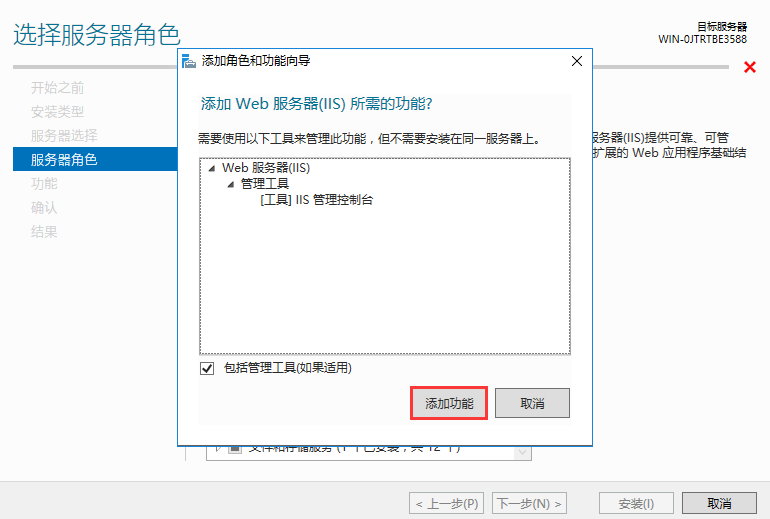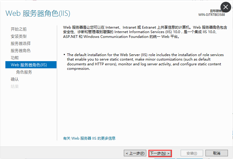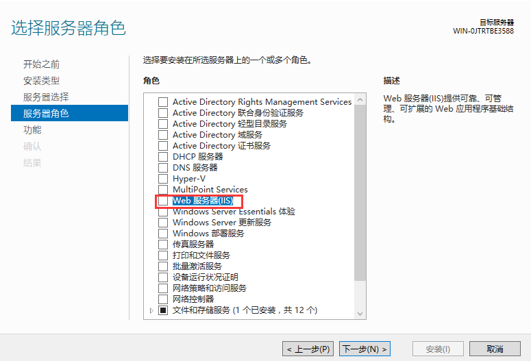 3、找到Web服务器(IIS)并选择,添加功能完成后点击下一步