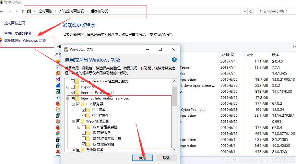 点击程序与功能→启动或关闭Windows功能,选择一下选项,打开ftp服务