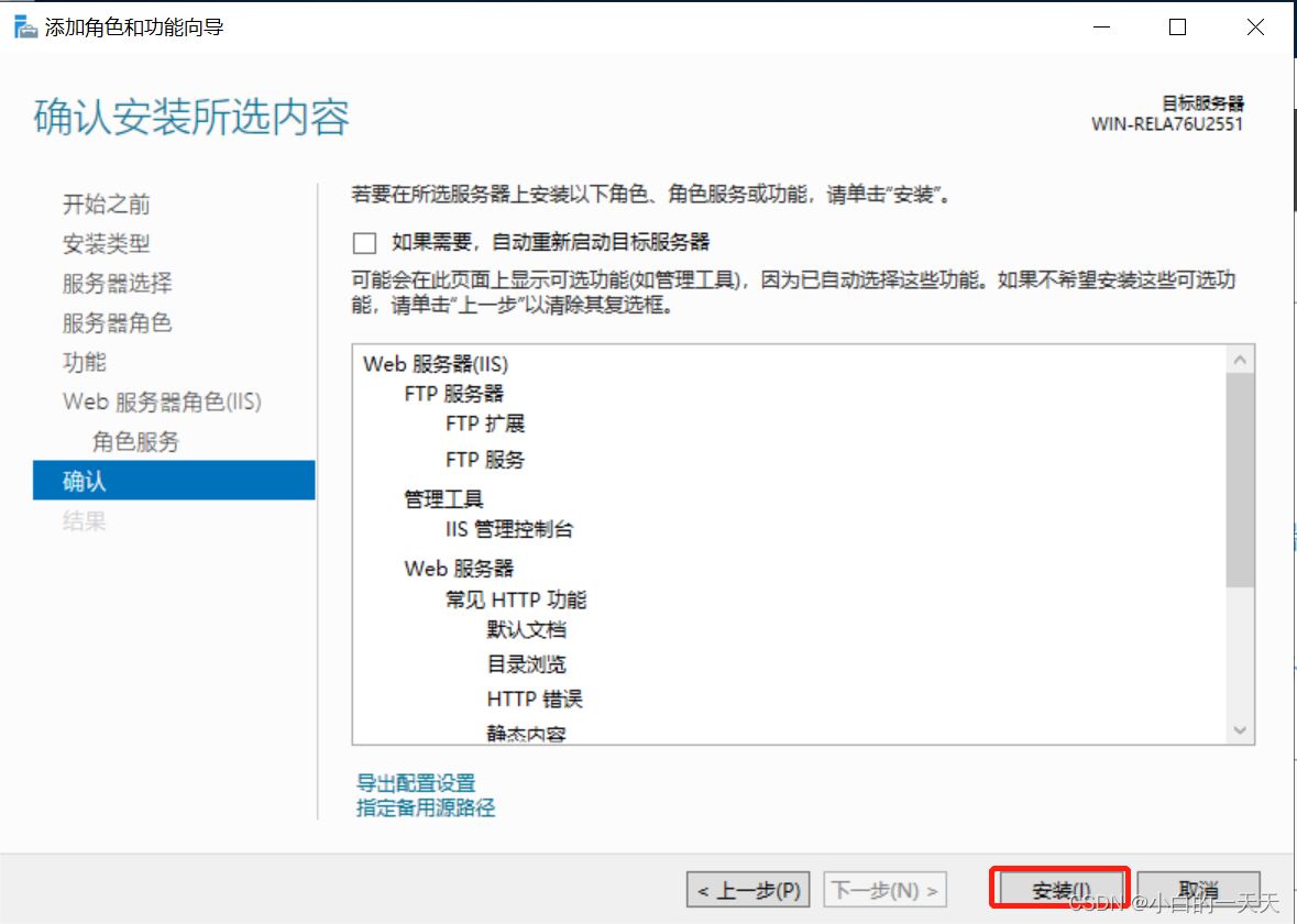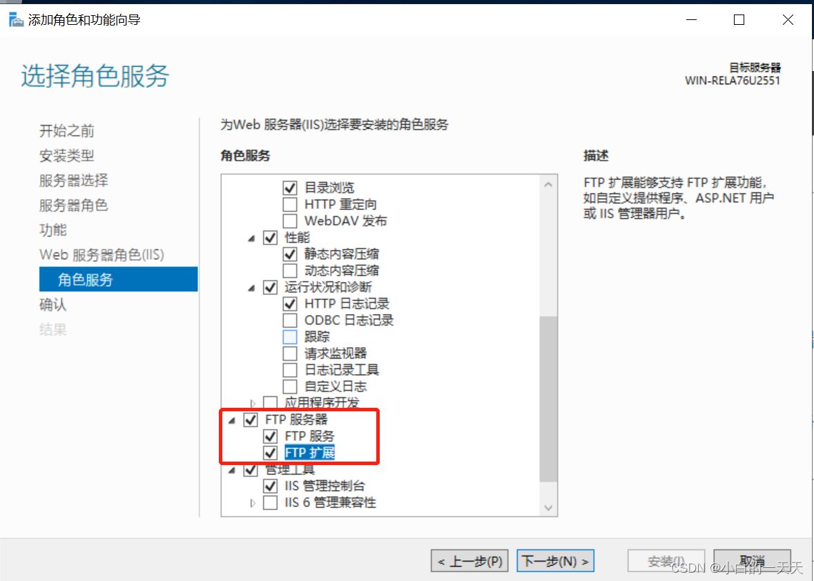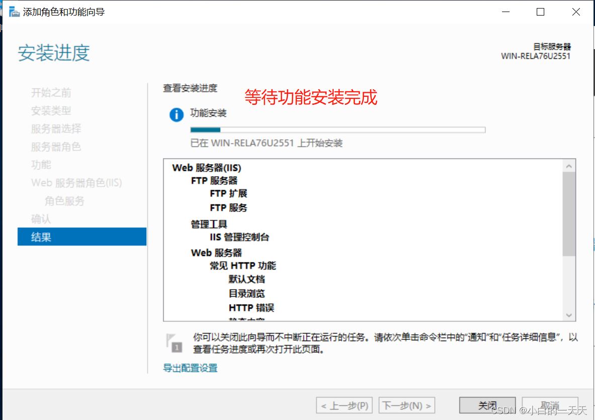 添加角色服务中勾选【FTP服务器及其服务和扩展】——【下一步】——【安装】——【等待安装完成关闭】