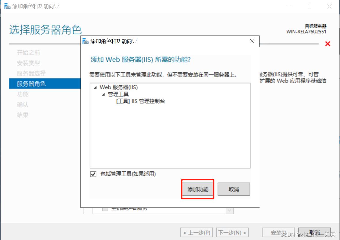 服务器角色页面选择【Web服务器(IIS)】——【点击添加功能】——【点击下一步】