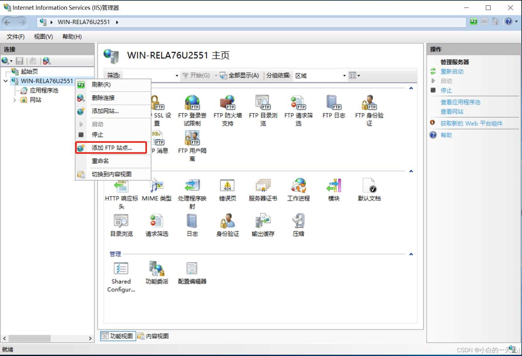 【右击服务器名称】——【选择添加FTP站点】