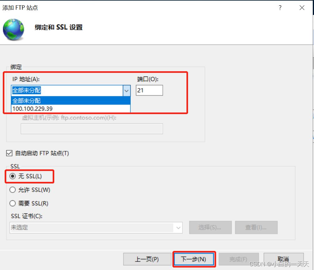 IP地址(A):本机IP地址(从下拉菜单选择)——此处是本机IP地址,端口号是21