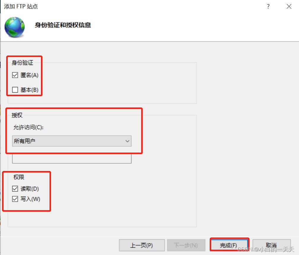 身份验证和授权信息——为了方便测试,此处身份验证先设置为匿名(以后可以更改),授权 允许所有用户,权限 读写都打勾。