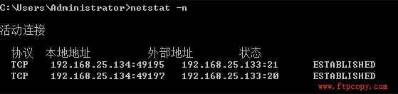 上面这张图是通过netstat命令查看到的ftp主动模式下TCP的连接信息,首先客户端使用49195端口连接服务器21端口建立控制连接,然后服务器使用20端口连接客户端49197端口建立数据连接。