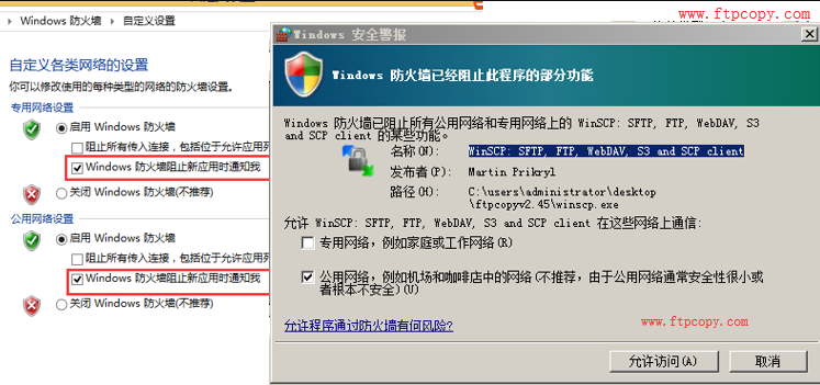 (3)客户端需要设置“允许应用程序通过防火墙”(WinSCP.exe、FlashFXP等)