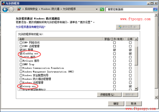 (2)如果防火墙没有开启“拦截通知”,则需要我们的应用程序添加到防火墙的“允许的程序”列表中。如图所示,允许FlashFXP.exe和WinSCP以主动模式连接FTP服务器。
