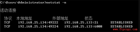 上面这张图是通过netstat命令查看到的“被动模式”下的TCP连接情况,首先客户端49222端口去连接服务器的21端口,建立控制连接。然后客户端的49224端口连接服务器的6008端口去建立数据连接。