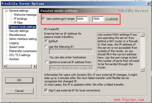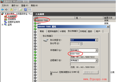 为了解决P端口的“准入”不被服务器防火墙拦截,需要在服务器端设定P端口的范围,并在防火墙中开启这个范围端口的“准入”。这张图是在FileZilla Server中指定被动模式的数据端口范围为6000-7000,然后在windows防火墙中配置6000-700端口允许“准入”。