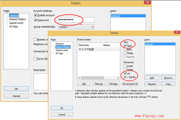 为每个账号设置密码和权限,比如说:如果只是下载数据,只要给FTP账号分配文件的read权限和目录的List列取目录权限即可。