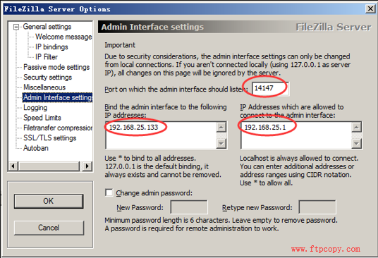 默认情况下FileZilla Server的控制台是只允许本机登录的,我们不需要做任何设置,保持默认配置即可。