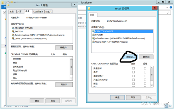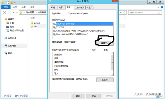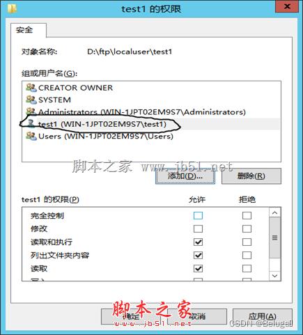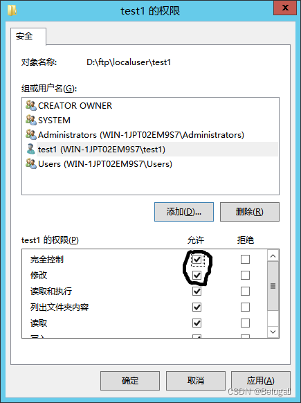 修改test1文件夹NTFS属性,使test1用户不仅有FTP的上传下载权限,也可以对其修改删除等完全控制权限。