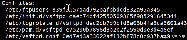 /etc/ftpusers #禁止vsftpd的用户列表文件 /etc/init.d/vsftpd #启动脚本 /etc/logrotate.d/vsftpd /etc/pam.d/vsftpd #安全策略 /etc/vsftpd.conf #配置文件