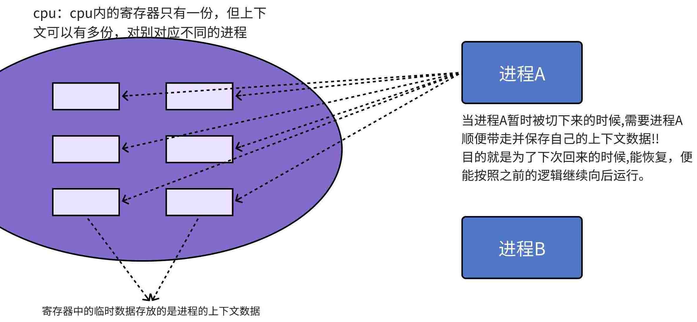 - 当恢复到这个进程的时候,就会把前一次本进程被中止时的中间数据再恢复到cpu寄存器里面去