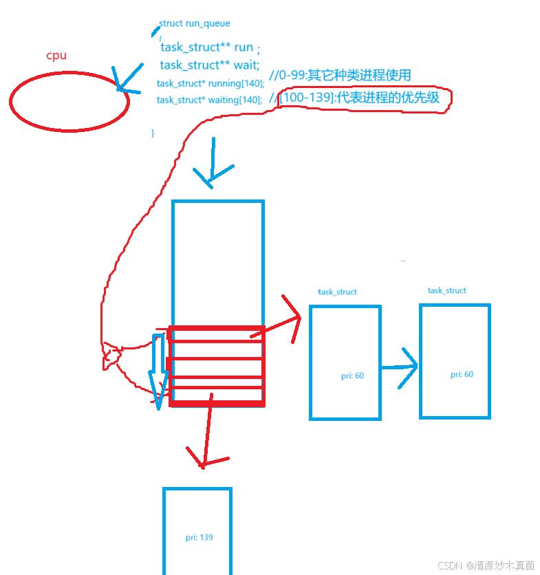 其中queue的类型为struct task_struct队列中的[0-99]为实时优先级我们不做考虑,而[100-139]则是我们进程的优先级序列。