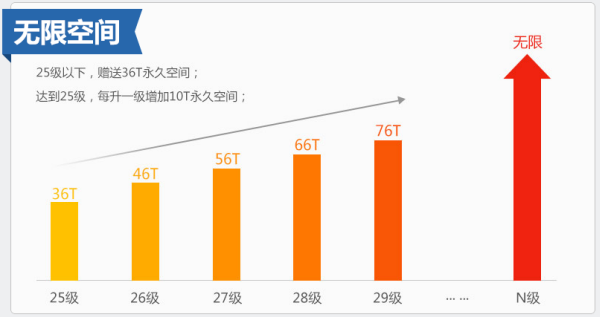 这次360云盘的无限空间同样有所限制,用户可以使用他们的PC客户端领取10TB容量的空间,使用移动客户端可以获得26TB,共36TB,在用户的等级达到25级后,每提升一级会增加10TB,可以无限增加。