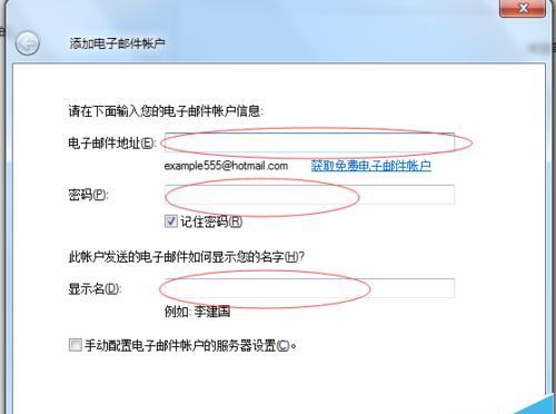 5、接下来就是添加邮件地址和密码了,请填写下图中标红的信息框,注意用户名密码的正确性,显示名那一行填写的时候请注意,这是用于当对方收到你的邮件的时候显示的名称,最好能显示你自己的真名,这样对方能够一目了然就知道是谁的邮件。