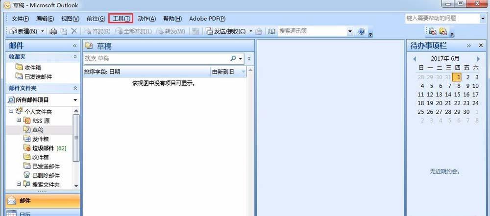 1、首先打开outlook邮箱,进入主界面,点击工具按钮