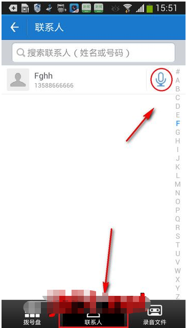 2、使用联系人进行拨号,需点击号码后面蓝色图标即可拨号