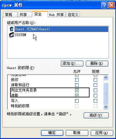 网络中很多机器使用NTFS文件系统,它的ACL功能(访问控制列表)可以对用户的访问权限进行控制,用户要访问这些机器的共享资源,必须赋予相应的权限才行。如使用Guest账号访问该机器的CPCW共享文件夹,右键点击该共享目录,选择“属性”,切换到“安全”标签页,然后将Guest账号添加到用户列表中,接着指定Guest的访问权限,至少要赋予“读取”和“列出文件夹目录”权限(图2)。如果想让多个用户账号能访问该共享目录,只需要添加Everyone账号,然后赋予“读取”和“列出文件夹目录”权限即可,这样就避免逐一添加和指定每个用户访问账号。此方法适用于采用NTFS文件系统的Windows2000/XP/2003系统。