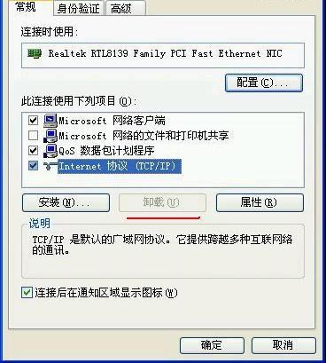 在WindowsXP中默认安装了TCP/IP。但是,如果出了网络问题想卸载后重新安装TCP/IP就不容易了:在“本地连接”属性中显示的此连接使用下列项目列表中单击Internet协议(TCP/IP)项,您将发现卸载按钮不可用(被禁用)。