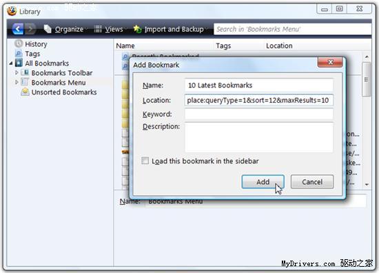 智能书签不仅仅是保存某个地址,而是根据你设定的规则动态地生成一个网站列表。比如,你可以设置一个“10个你最常访问的页面”的书签,或者在标题中含有某特定关键字的20个你最后访问的网站。CTRL+Shift+B打开智能标签管理,在左侧选中“书签菜单”然后点上方的“组织”—“新书签”,给该智能书签添加些描述性语言,例如“10个最近添加的书签”,在地址栏里需要输入一些参数,例如本例10个最近添加的书签则输入:place:queryType=1&sort=12&maxResults=10.此外最常用的还有,“10个最近访问的书签”:place:queryType=0&sort=8&maxResults=10。Mozilla官方还给出了其他很多种应用范例。