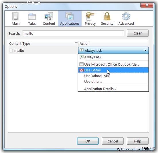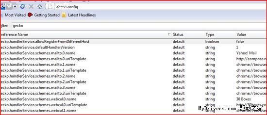 “工具”—“选项”,打开“程序”搜索mailto,选择YahooMail即可。Gmail是不在默认的设置列表中的,您可以通过简单步骤自行添加:在Firefox地址栏输入about:config并回车,在“过滤器”一栏输入gecko选择第一个gecko.handlerServiceAllowRegisterFromDifferentHost并双击,改变其值False为True,然后在浏览器复制粘贴:javascript:window.navigator.registerProtocolHandler("mailto","https://mail.google.com/mail/?extsrc=mailto&url=%s","Gmail")回车。