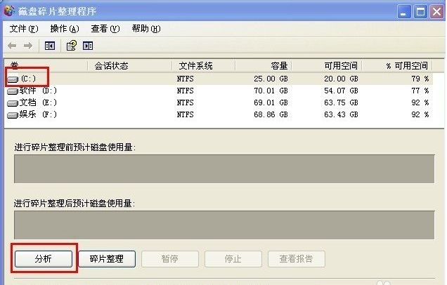 2、进入后点击"碎片整理"按钮,开始整理C:盘;