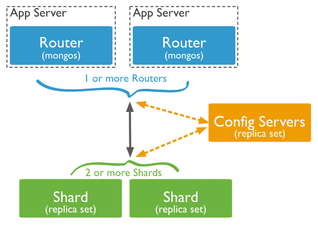 MongoDB 使用 sharding(分片)来支持超大数据集和高吞吐量的集群部署,通过将数据集水平拆分为多个分片,并将每个分片分布在不同的服务器上。每个服务器(或分片)都可以独立处理一部分数据写入和查询负载,从而提高整个系统的扩展性和性能。其架构如下: