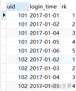 (2)其次我们使用窗口排名函数row_number对同一用户的不同登录时间进行排名,得到新一列为rk。